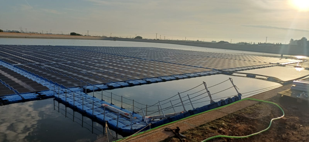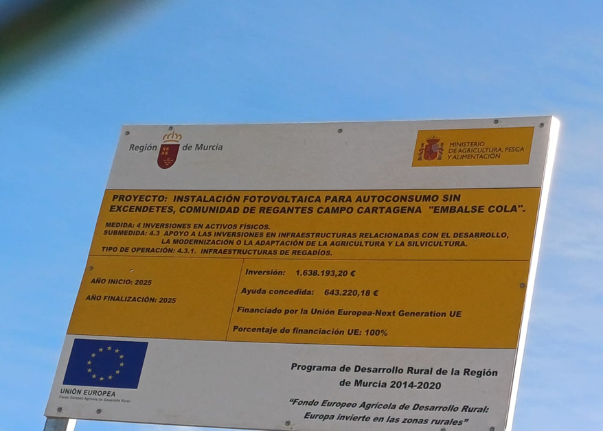 La Comunidad de Regantes del Campo de Cartagena continua su apuesta por las energías renovables con la ejecución del proyecto “Instalación de Cubierta Fotovoltaica Flotante para Autoconsumo en el Embalse Cola”, que incorporará 2.600 paneles de 600 Wp y alcanzará una producción anual estimada de 2.161 MWh.