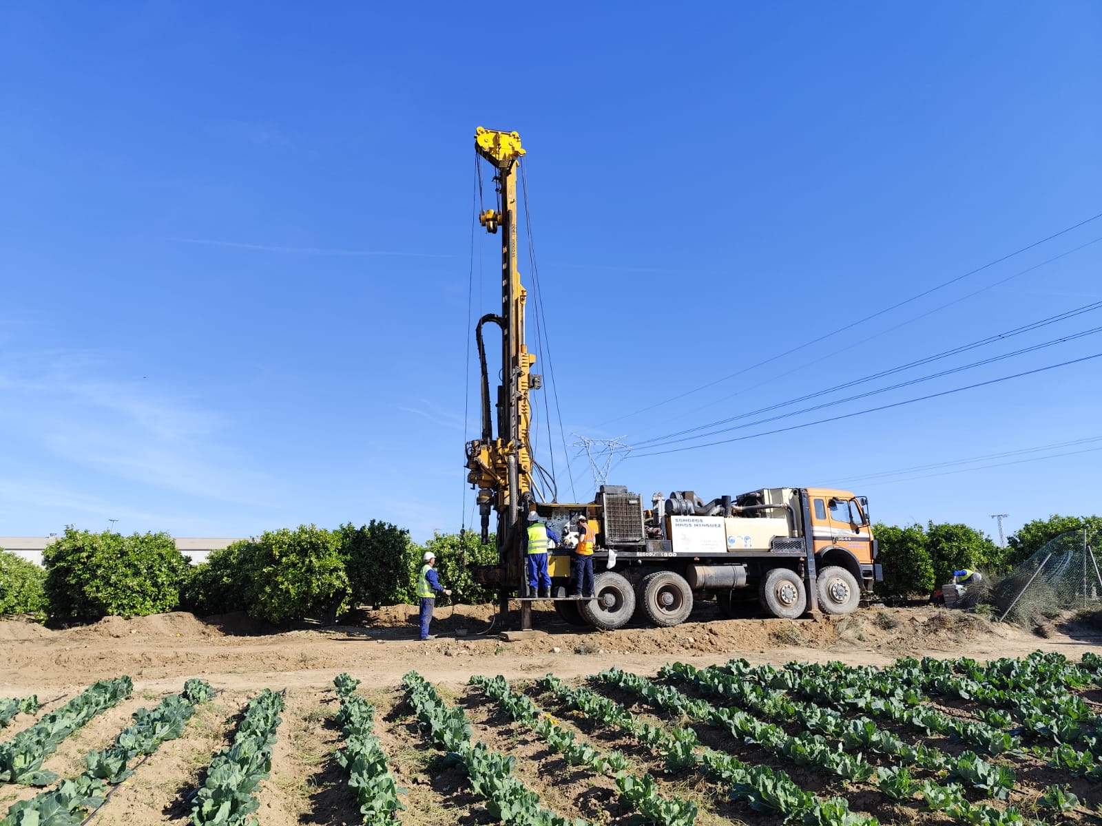 Los trabajos se inician con la perforación del primero de los sondeos verticales, que alcanzará una profundidad de unos 50 metros. Este sondeo se está ejecutando mediante rotopercusión con circulación directa, es decir, el avance se logra combinando el impacto del martillo de fondo y su rotación, por el interior del varillaje baja agua que refrigera el sistema y asciende por el espacio anular sacando el detritus al exterior. Una vez concluida la perforación se instalará una tubería de PVC‑U de 4 pulgadas de diámetro, ranurada a lo largo de toda su longitud, salvo los primeros metros. El objetivo de esta configuración es permitir la toma de muestras a distintas profundidades y la realización de registros continuos en toda la columna de agua, posibilitando el análisis de diversos parámetros, como salinidad, temperatura y contenido en nitratos, entre otros. (Ver detalles)