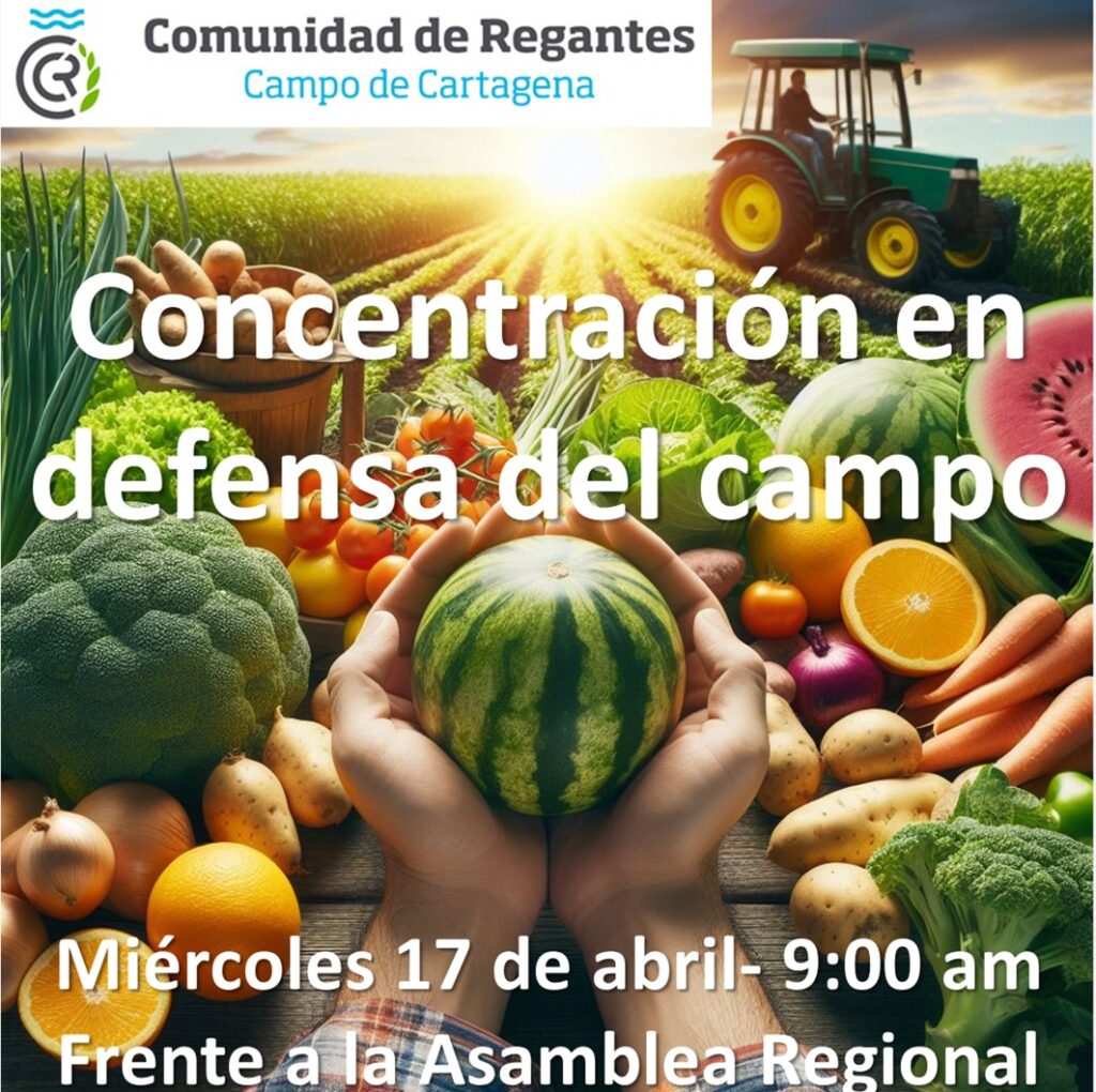 La Comunidad de Regantes del Campo de Cartagena se suma a la concentración en defensa del campo frente a la Asamblea Regional, convocada por varias organizaciones para el miércoles 17 de abril a las 9 de la mañana.